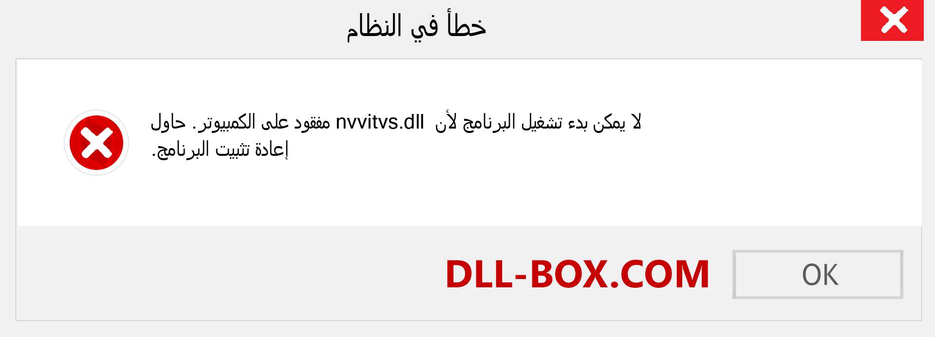 1. لا يمكن بدء تشغيل البرنامج لأن nvvitvs.dll مفقود من جهاز الكمبيوتر الخاص بك. الرجاء إعادة تحميل البرنامج \ التطبيق لعلاج هذه المشكلة.